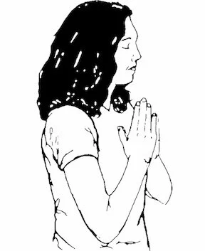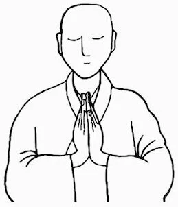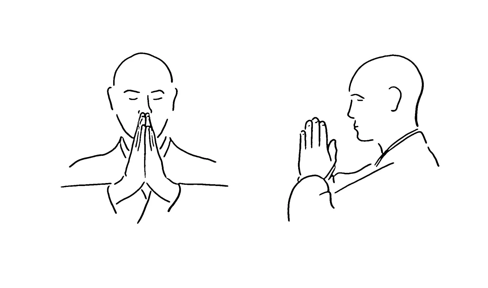 las manos se colocan en frente de la cara con las palmas haciendo presión una contra la otra; hacer esto significa no dualidad, ninguno está por encima del otro, tanto el que da como el que recibe la reverencia,