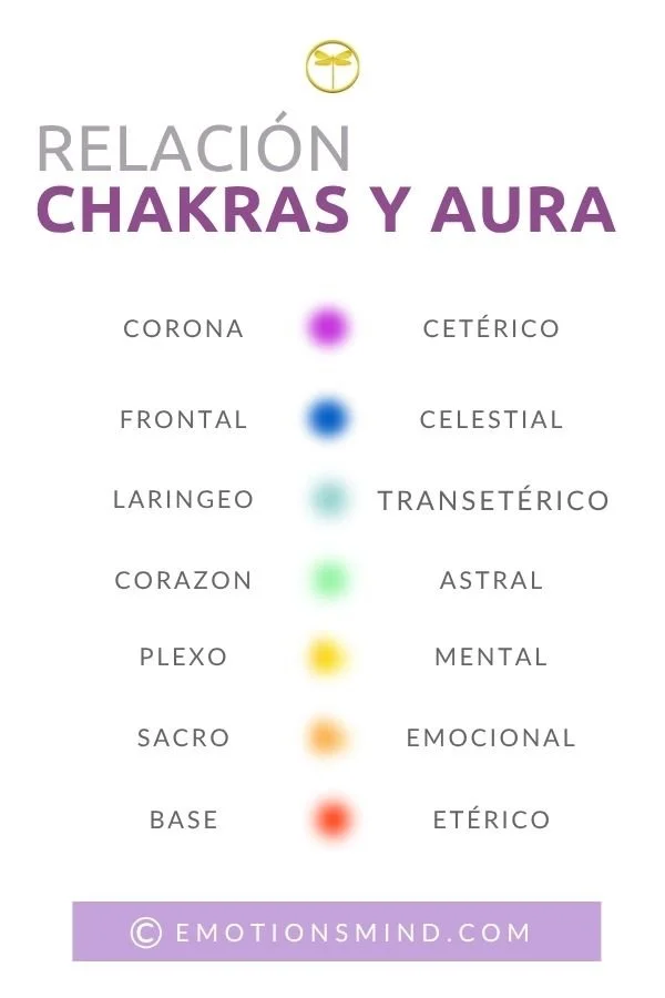 El aura tiene una relación directa con los chakras, porque a través de la energía que estos producen, es lo que da forma, mantiene y que comunica con cada uno de los cuerpos áuricos, por resumirlo bastante.